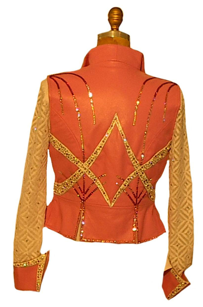 Vest has a flip up high lapel collar, split peplum and front zipper. Blouse is white with lace sleeves and imbedded crystals. Stand up collar and front zipper. White.