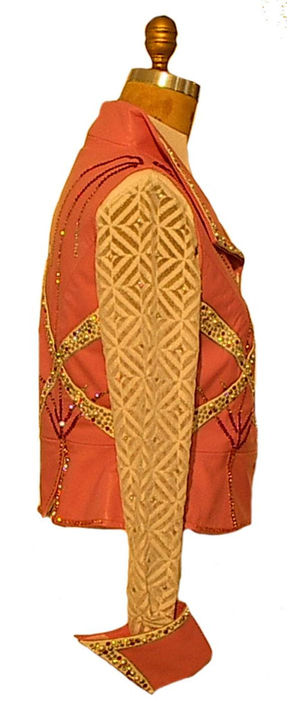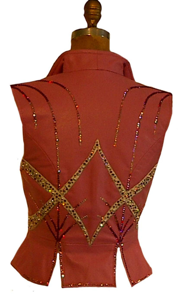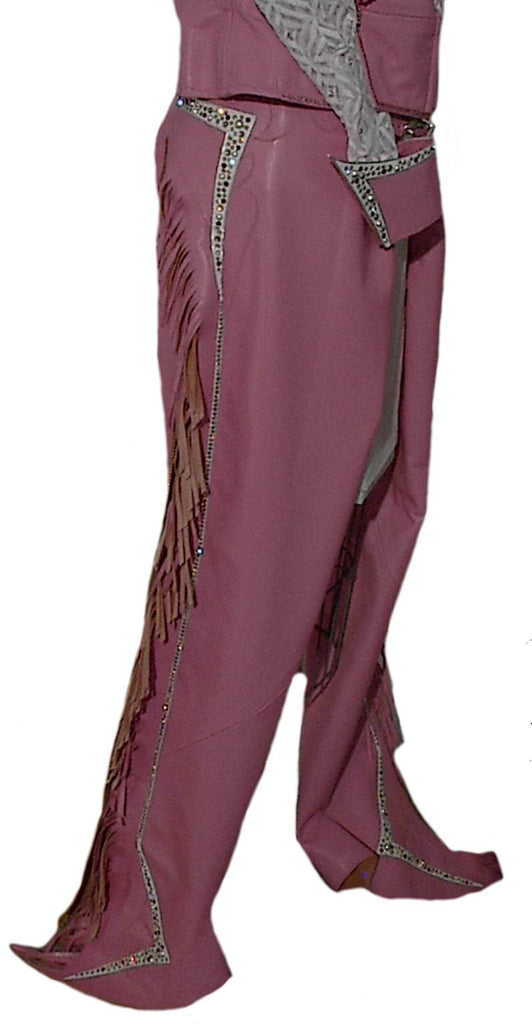 Set includes a vest combo, chaps and pants. Vest and chaps are of pink lamb smooth out, trimmed in white and fuschia.
