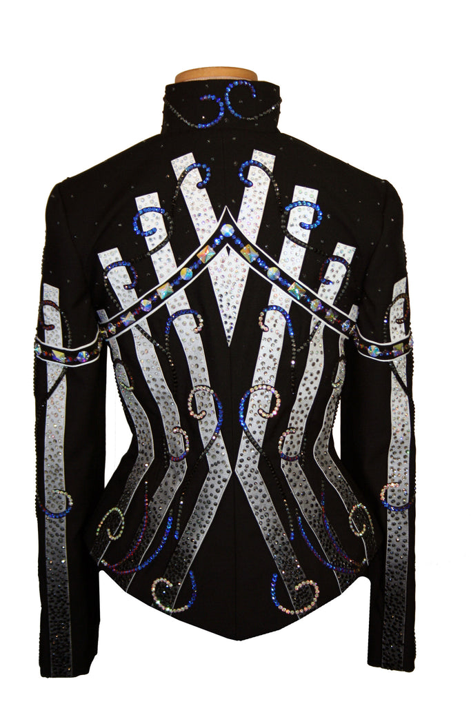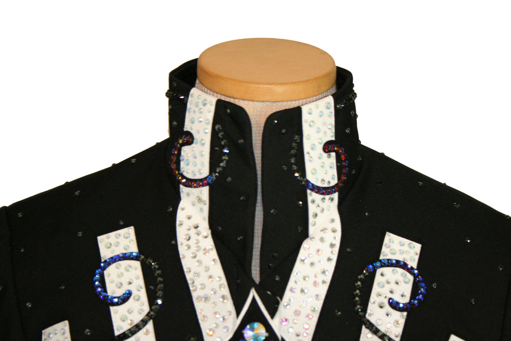 Black base jacket has white, charcoal and royal trim. 1/2" side seams, 2" sleeve seams, curved hemline and a Victorian Bri collar. Airbrushing, fully lined with over 6600 Swarovski crystals. Hand wash, drip dry.