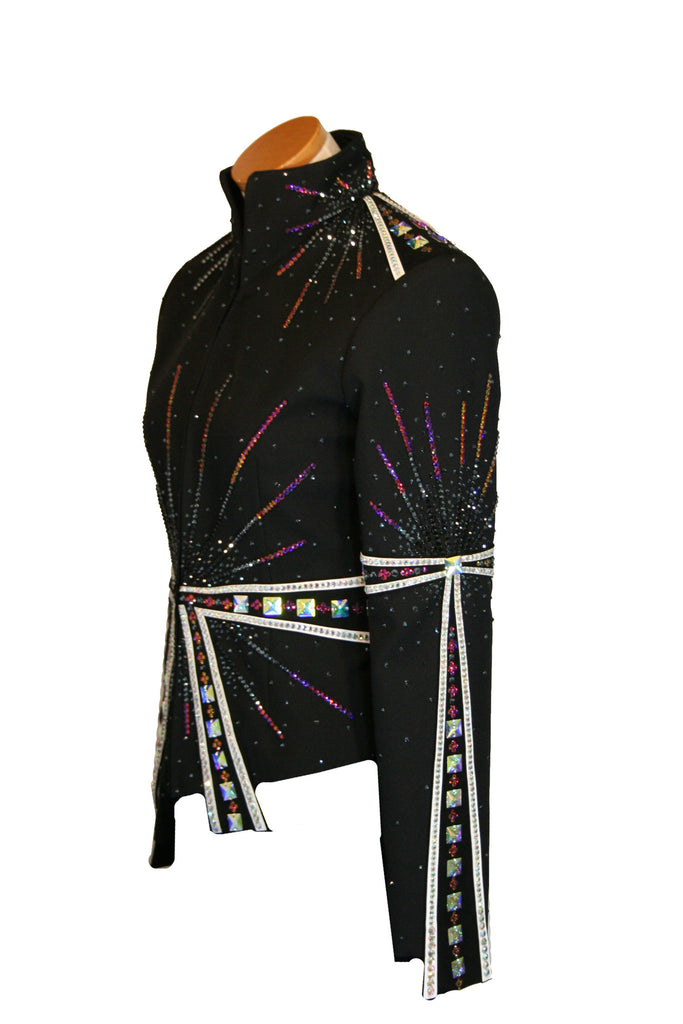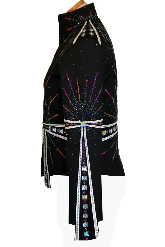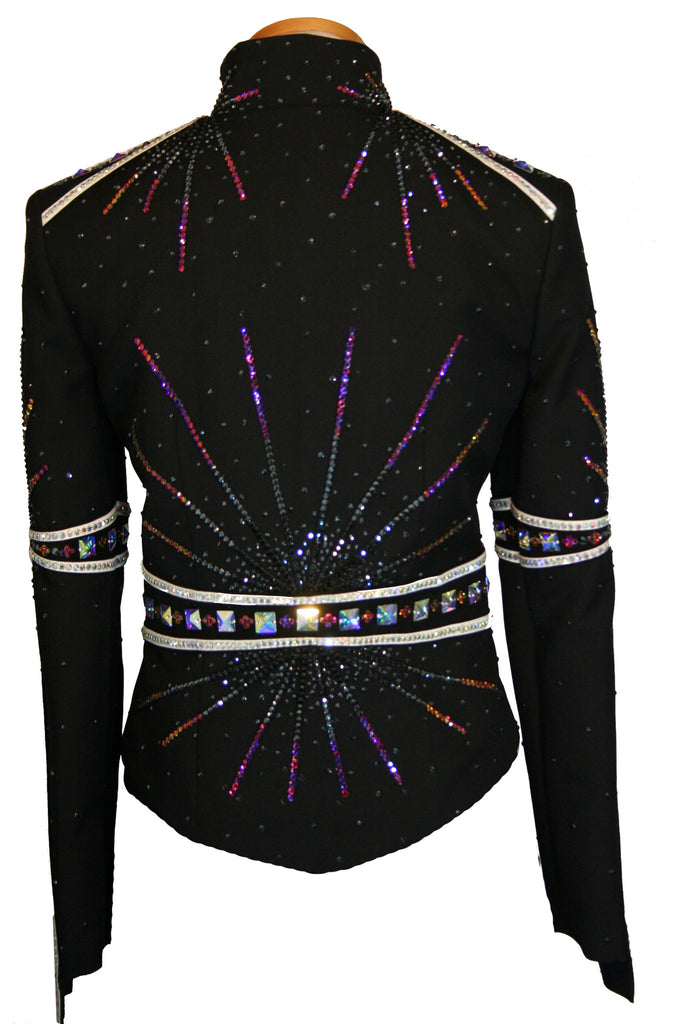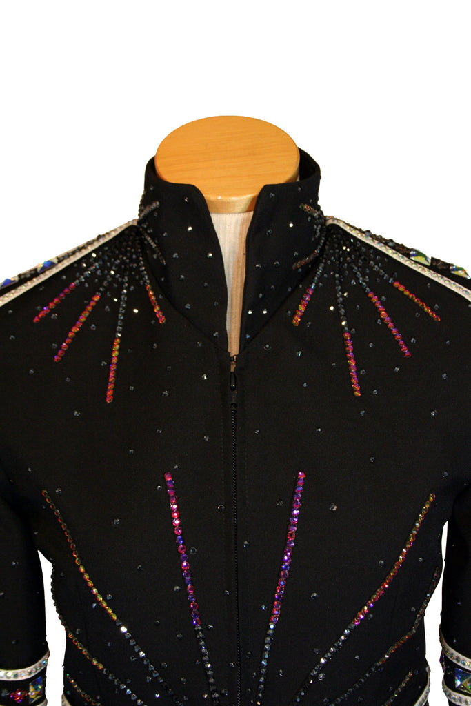 In like new condition, it has a Victorian Bri collar, pointed hemline and a center front meet zipper. Trimmed in white lines with approximately 3300 Swarovski crystals in black, amethyst and AB's. Jacket has 1" side seams and 2" sleeve hems.