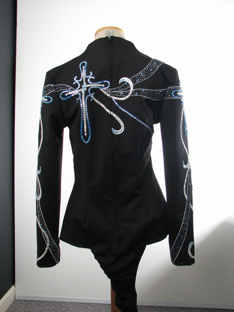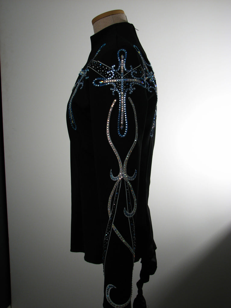 Nice black spandex equitation blouse with blue and white trim and a moderate amount of stoning. Stand up collar with rounded edge at center front. Stoning contains pearls in a random pattern with other crystals.